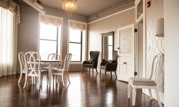 Soft & pretty with a downtown view. This 2nd floor room is the perfect space for casual gatherings/meetings, small bridal/baby showers, bible study, book club, makeup parties, and more.